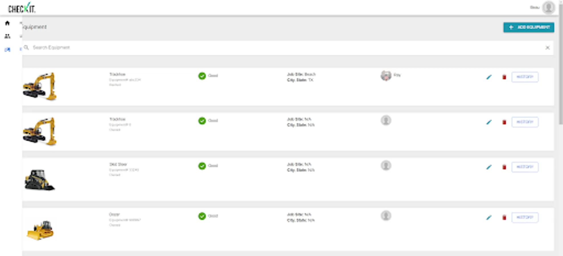 CheckIt equipment management provides a digital solution for managing the equipment inventory, enabling users to easily add, edit, and remove equipment from the system. Our platform also allows users to track the location of equipment, job site/number, as well as any maintenance and repair issues