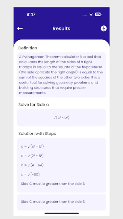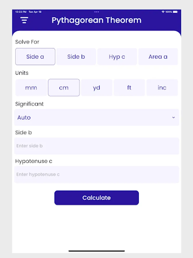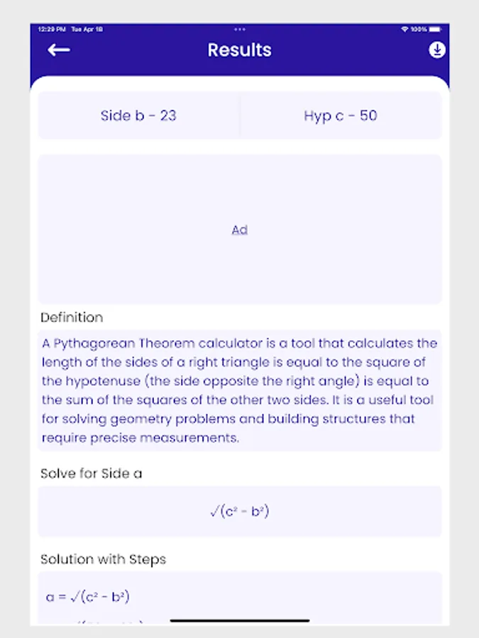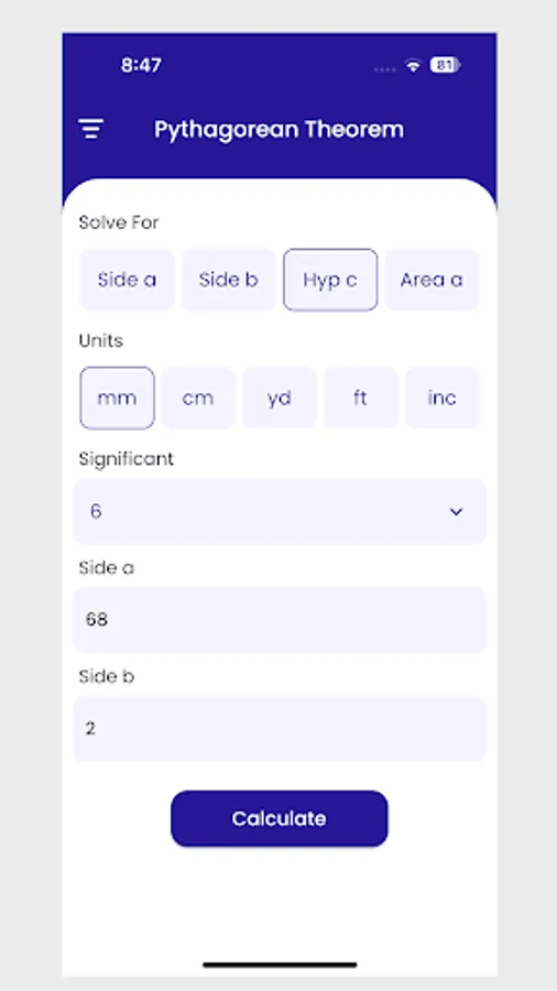 Give a try this Algebra and Geometry calculator app right now to get a detailed solution to any equation. Just insert values of any 2 sides in this hypotenuse calculator. Get quick results with steps by using this Pythagorean theorem calculator.