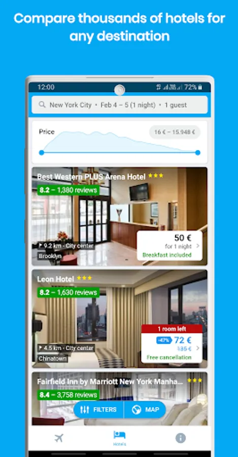 • Compare offers from major travel sites such as Hotel.com, Agoda, Expedia, Booking.com, Venere.com, HotelClub, HolidayInn, Marriott, LastMinute, Crowne Plaza, GetaRoom, AirBnb, Trip.com, HostelWorld, Best Western and many others!