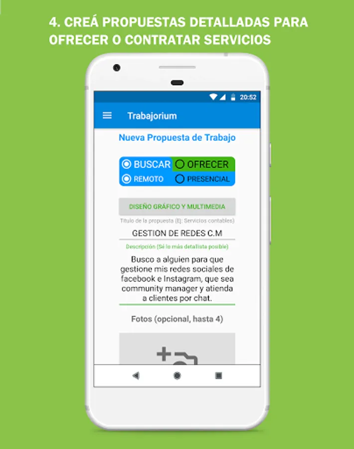 We have more than 20 categories of services that are the most required at home or companies and we have the possibility of registering as WORKERS users (to offer services) or CLIENT users (who contract services) all within the same app.