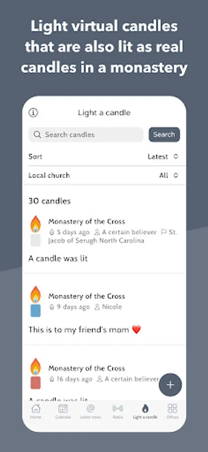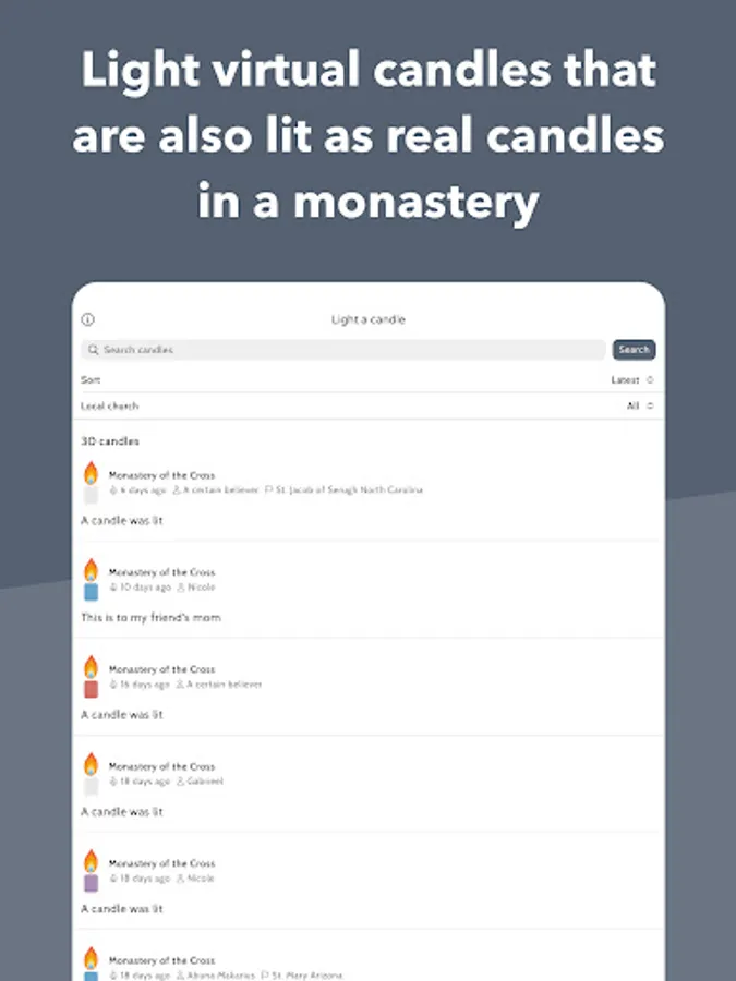 • The opportunity to light virtual candles that are also lit as real physical candles in a monastery.