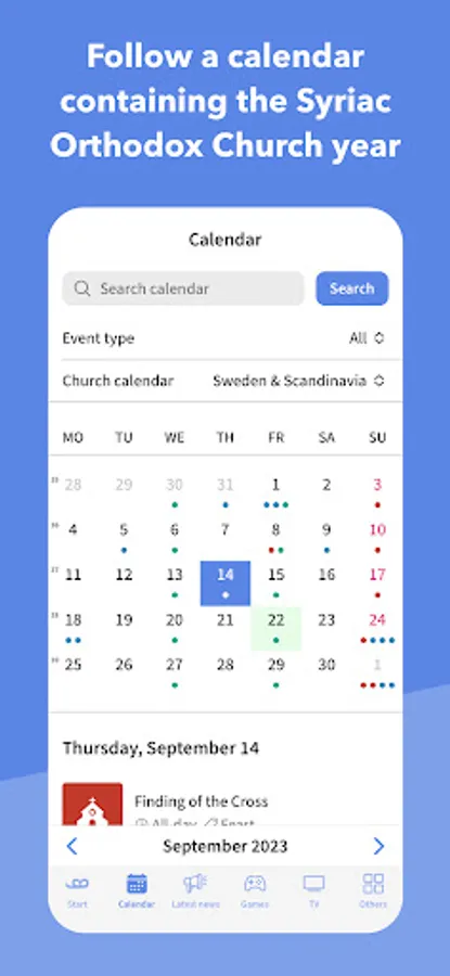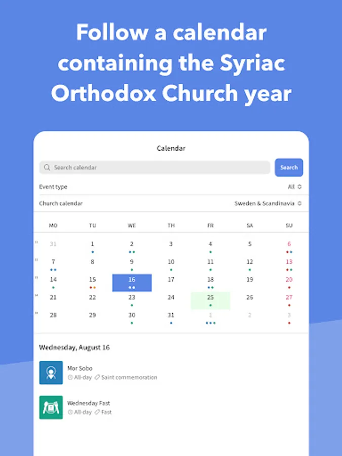 • A calendar containing the Syriac Orthodox Church year with all feasts, fasts, etc.