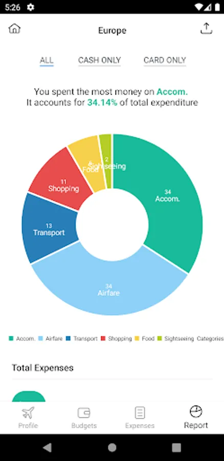 Check your travel expenses statistics. You can see the pie graph and the total amount by category.