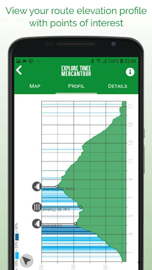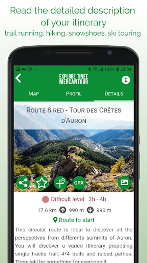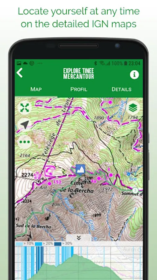 • Position at any moment on the map and the profile thanks to your smartphone GPS system