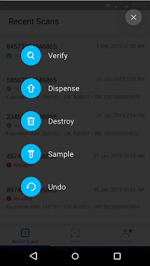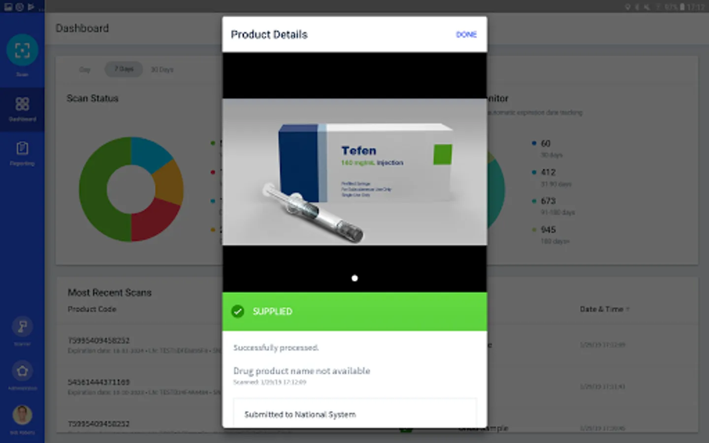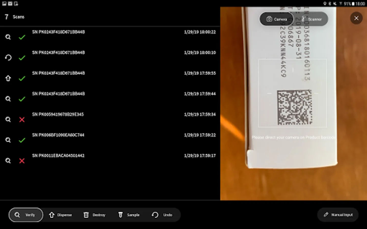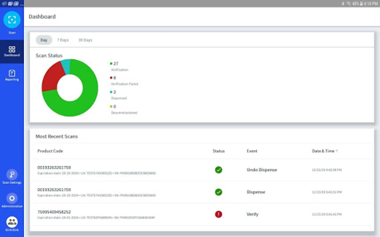Smart Rx Manager uses your device's camera to scan the 2D bar codes that are required by FMD. Smart Rx Manager can also be paired with a wireless bluetooth scanner to provide maximum flexibility when verifying or decommissioning prescription drugs. Reporting screens allow you to review all your scan data to review status as well as have insight as to when medicines may expire.