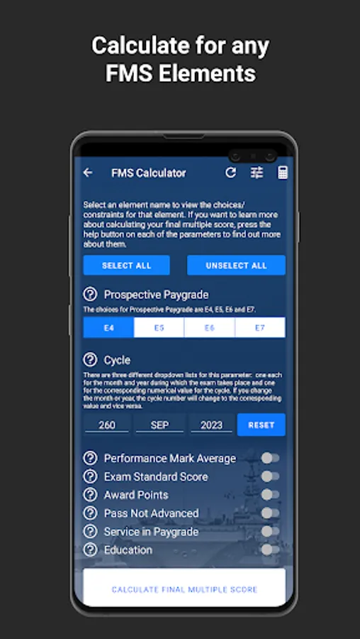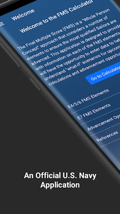 This mobile app calculates projected Final Multiple Scores (FMS) for E3 through E6 enlisted Sailors eligible for advancement to pay grades E4 through E7. A Sailor's FMS standing is one of two primary factors that determine a Sailor’s opportunity to advance to the next paygrade during an advancement cycle.