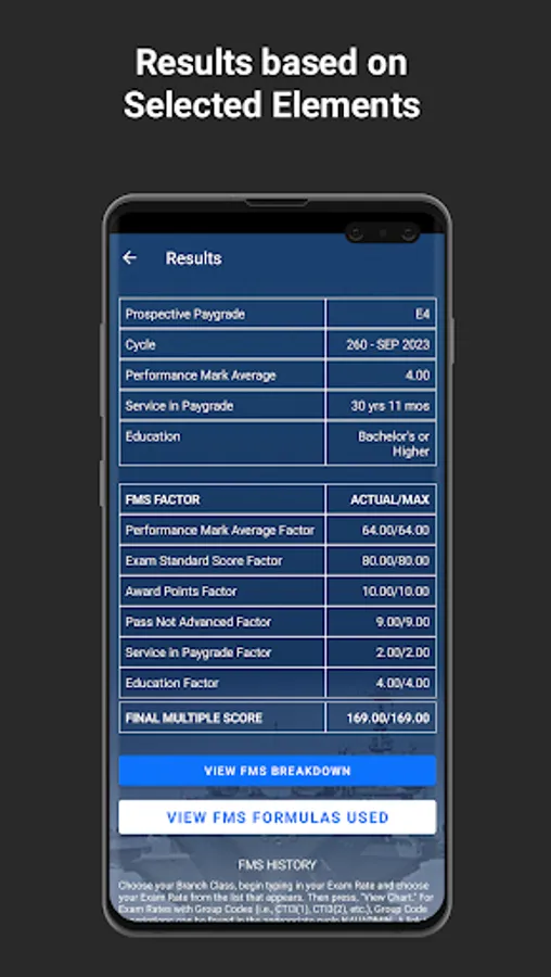 -- Personalization: The FMS Calculator mobile app is programmed to account for the different formulas used at each paygrade and gives users the ability to display maximum points that can be accumulated for each element.