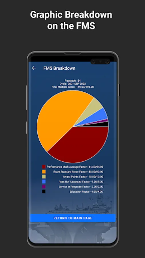 The FMS Calculator mobile app uses the FMS formula to calculate the projected FMS, giving Sailors a total score based on input of individual FMS elements. The app provides helpful information for navigating the FMS parameters and elements. The FMS Calculator app also provides an FMS pie chart breakdown as well as a historical view by branch class, exam rate, and group, if applicable.