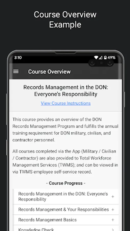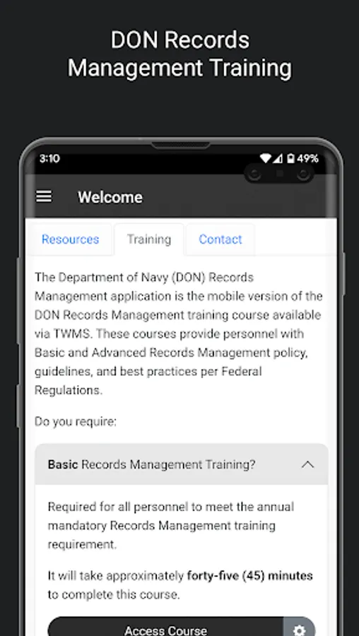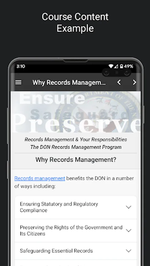 Updated for 2023, the Department of Navy (DON) Records Management application is the mobile version of the mandatory DON Records Management training course. This annual, app-based training provides personnel with Records Management guidelines and best practices in accordance with Federal regulations. It helps users understand general recordkeeping methods, the records lifecycle, dispositions, essential records, electronic records, senior leaders’ records, and related information. In particular, the app will help users understand their duties regarding the records they are responsible for maintaining. Some of those responsibilities include: