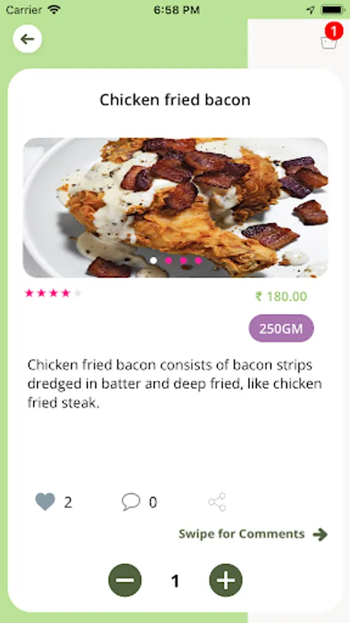 6. By clicking directly over the food item user can view the detail of the food item with preparation item used in the dish along with adding quantity functionality to directly add over the cart.