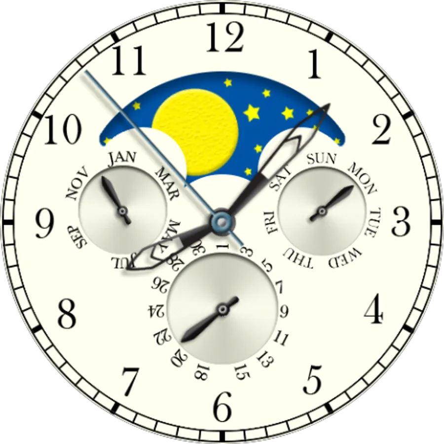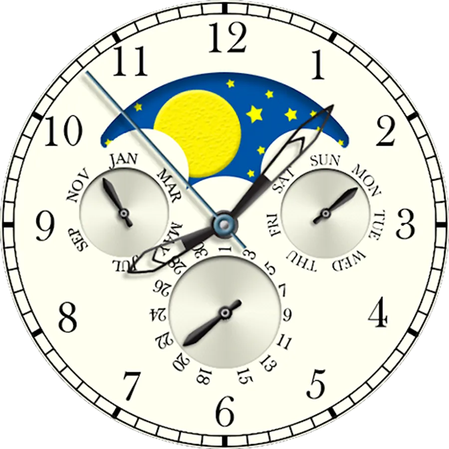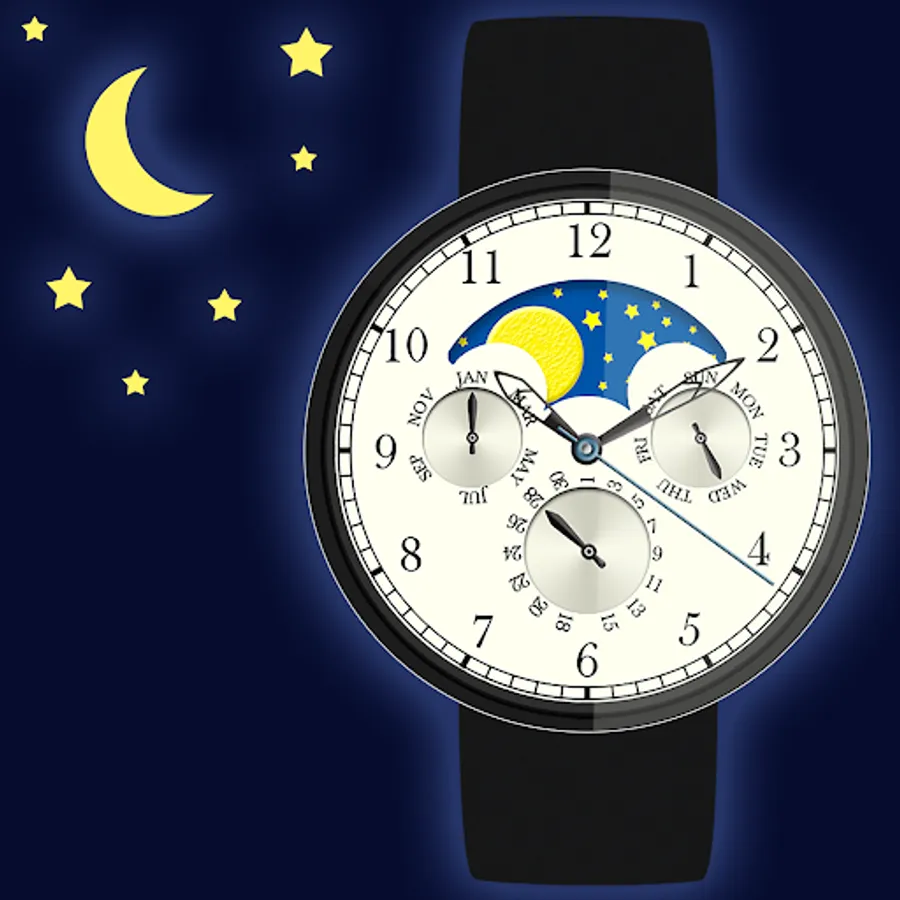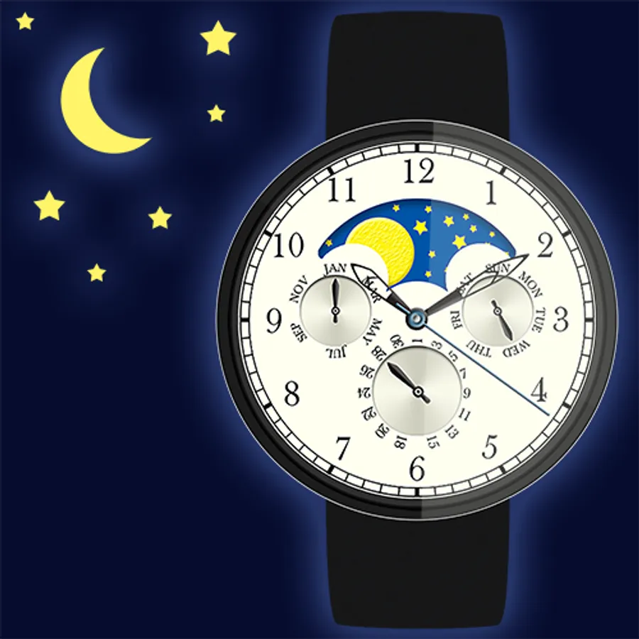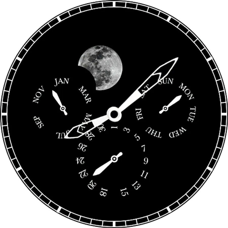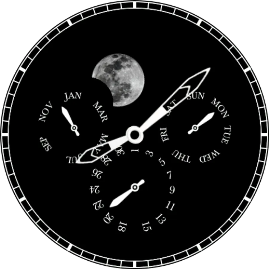 An elegant watch face that shows the current moon phase, month, day of week and date.