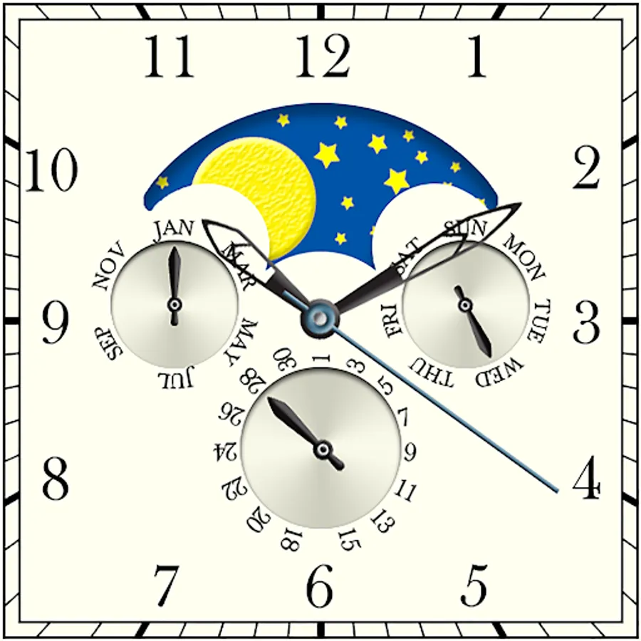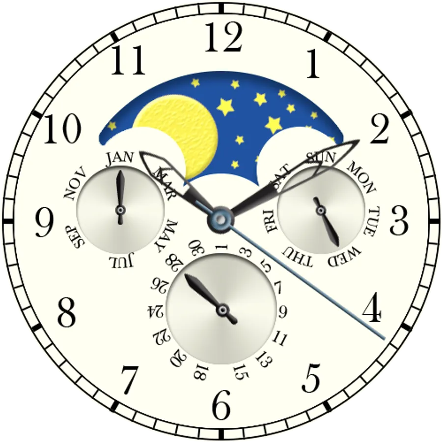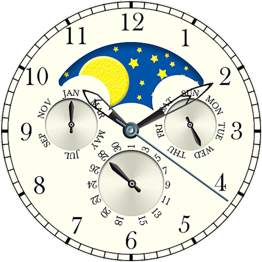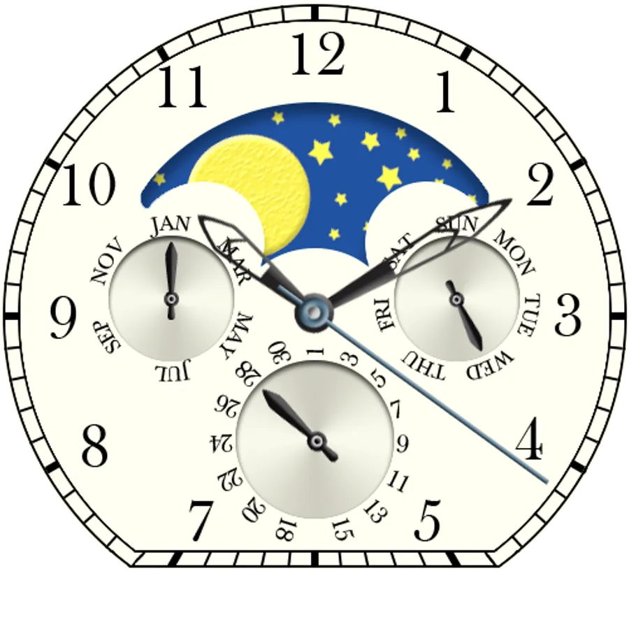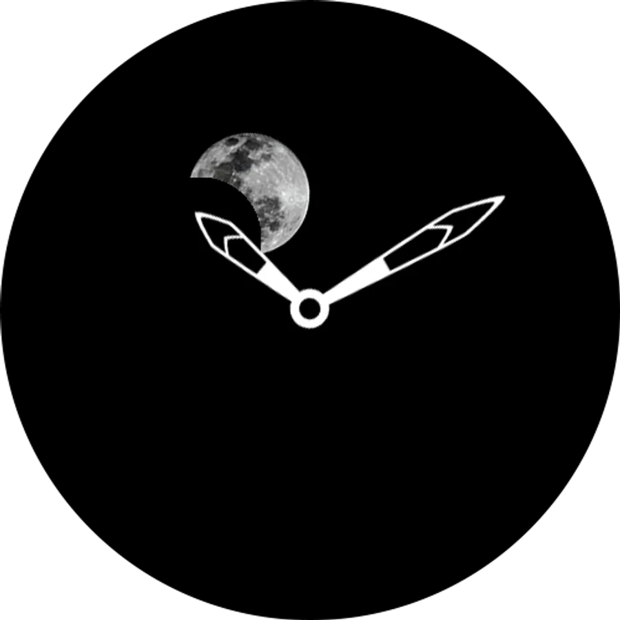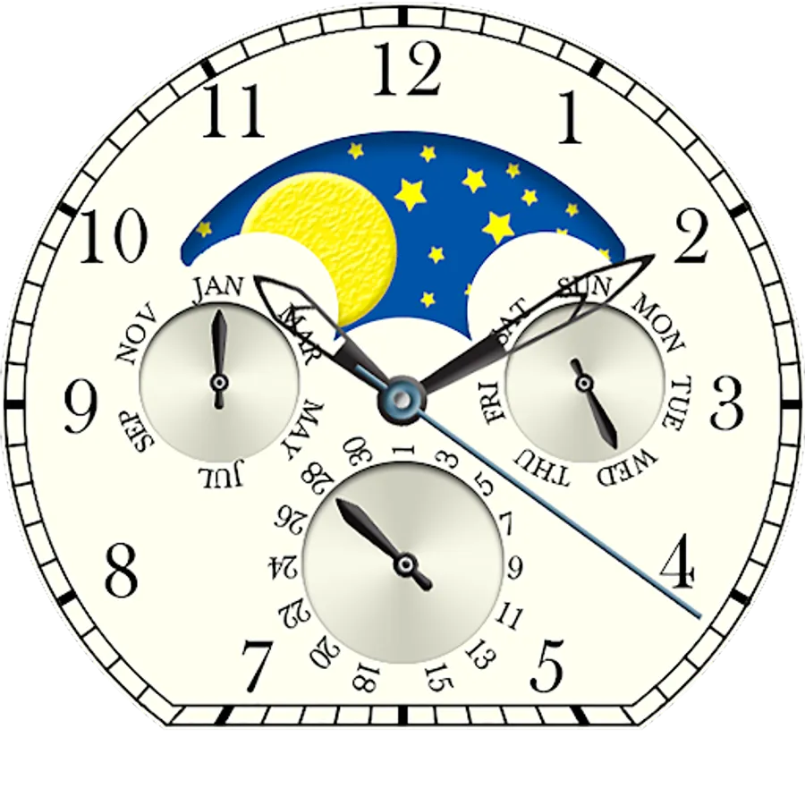 An elegant watch face that shows the current moon phase, month, day of week and date.