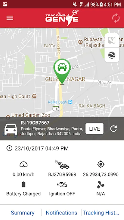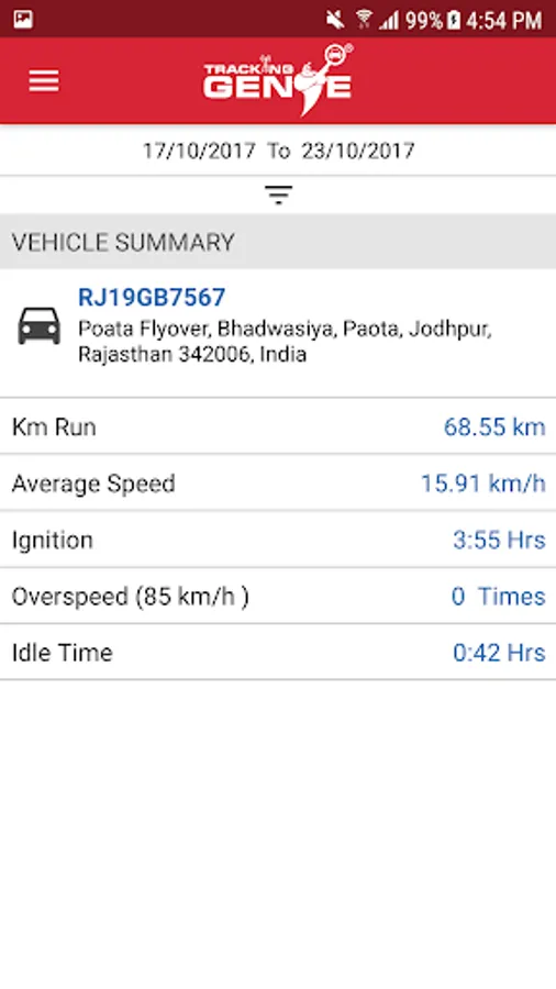 This app provides a way for existing Tracking Genie customers to keep track of their vehicle using an android device. This app lets TrackingGenie users view the current location and speed of all their vehicles. Using this app TrackingGenie customers can view Summary Reports, Geo Fence and Over speeding Notifications along with Tracking History of any of their vehicles.