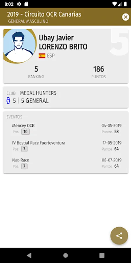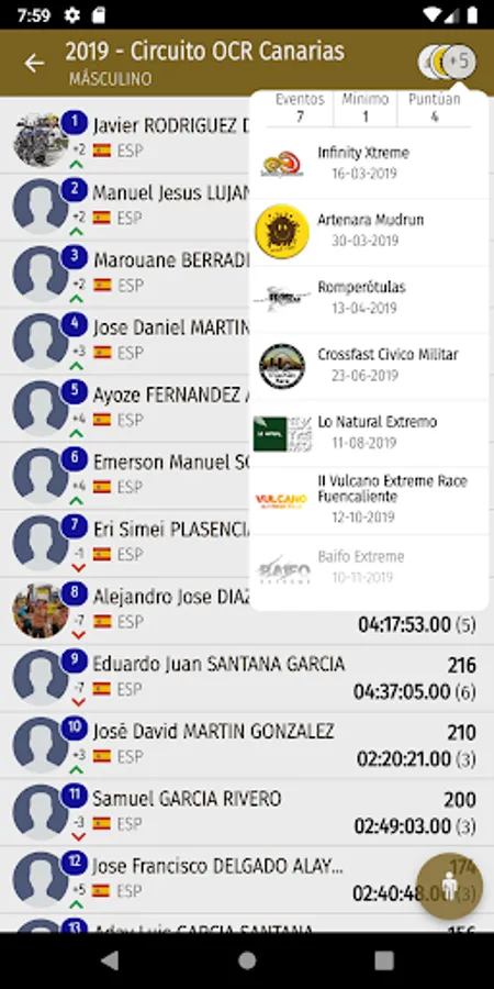 It also allows you to check the ranking in all the Championships. You will be able to see the evolution of the athletes in the different associated tests. If you are a participant, you can check at the end of each test your position in the ranking, how many positions your opponents move forward or backward, which tests score the most and where to participate to continue adding points and getting ahead in the ranking.