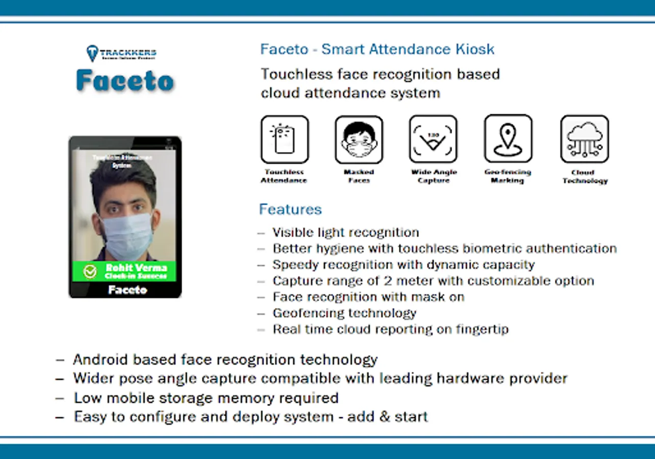 Faceto Kiosk is an attendance management application from Trackkers Security that allows employees to check in and check out through facial scanning. It captures an employee’s image, matches it with the profile pictures stored in their server, and allows employees to check in and out only when their identity is confirmed. This application can be installed on any internet-capable tablet, phone, or computer, and kept near the reception or the front desk so employees can check in or out whenever they enter or leave your organisation. Their attendance will be marked, and their total working hours will be automatically recorded inside the application.