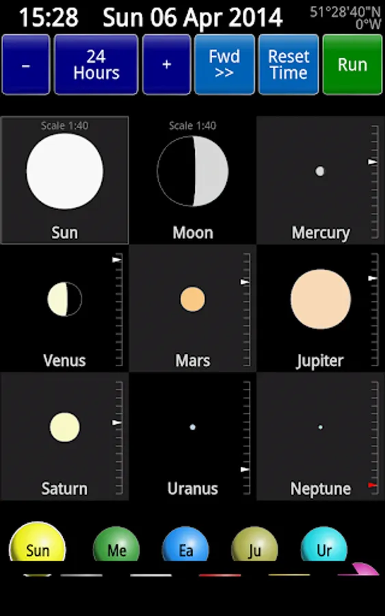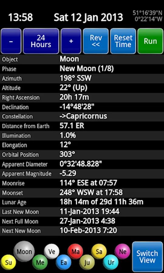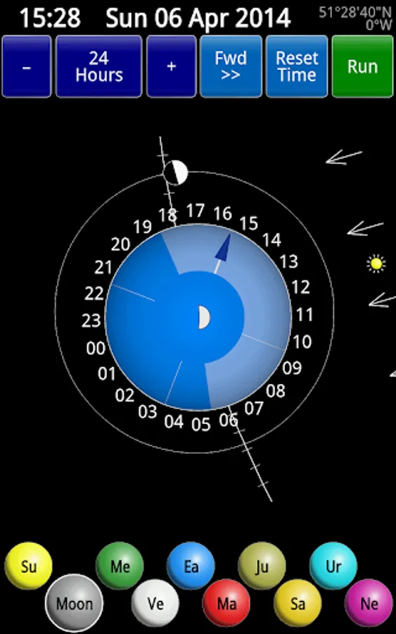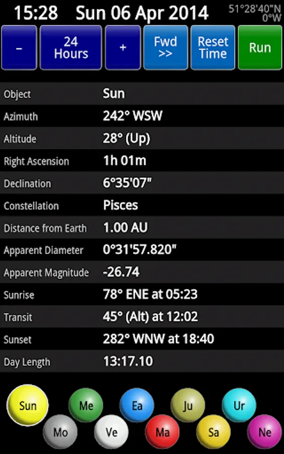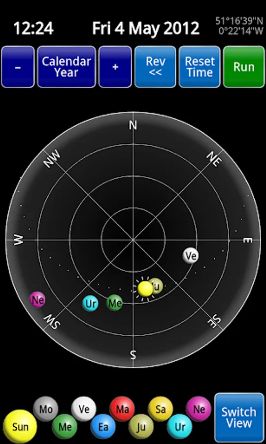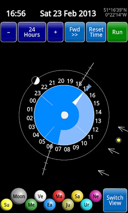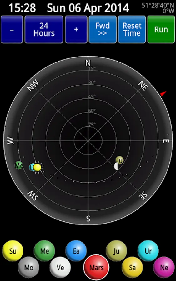 - Sky view, showing the planets locations in the sky, as viewed from your current GPS location.