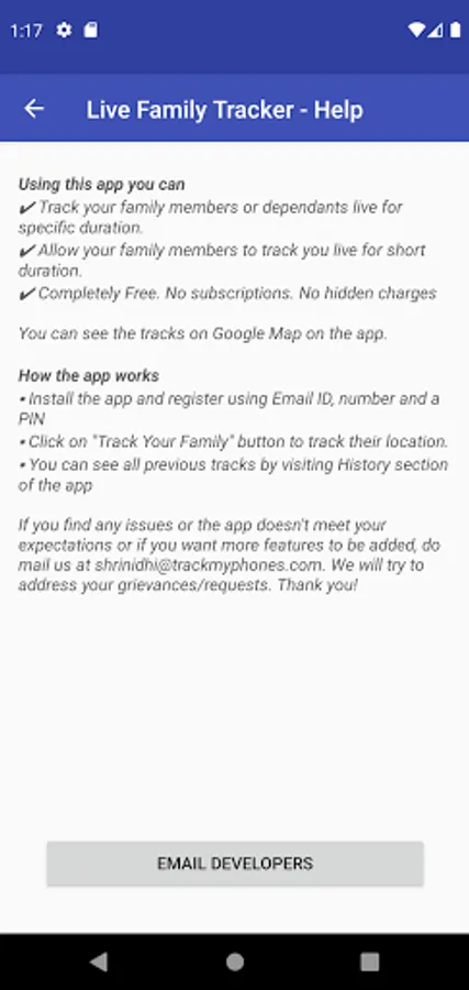 If you find any issues or the app doesn't meet your expectations or if you want more features to be added, do mail us at shrinidhi@trackmyphones.com. We will try to address your grievances. Thank you!