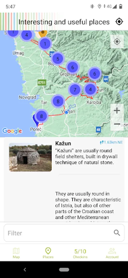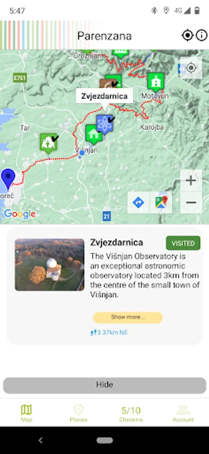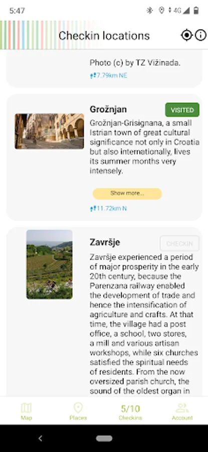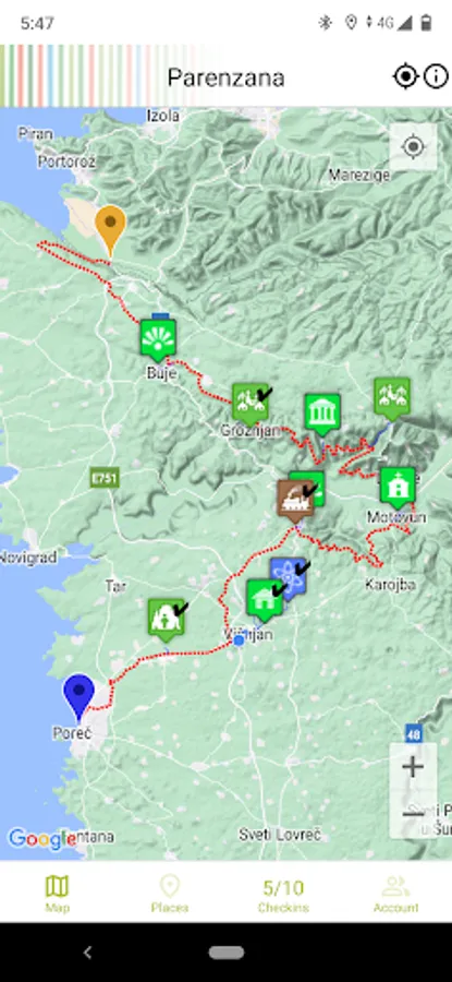 If you want you can use the app for navigation or you can "collect" checkins and become an official (and certified) "Friend of Parenzana". To get that you need to checkin on at least 10 of the predefined checkin locations. Checkins are your (selfie) photos which must be made in those places.