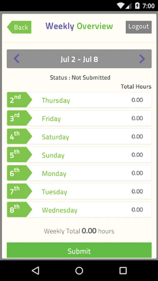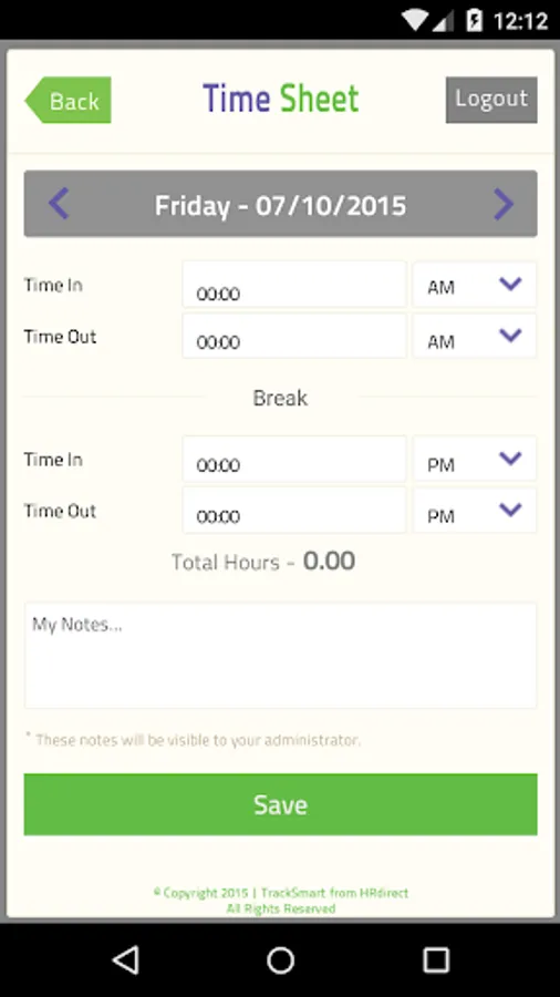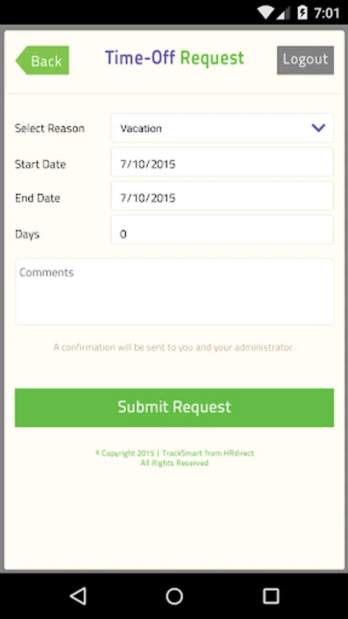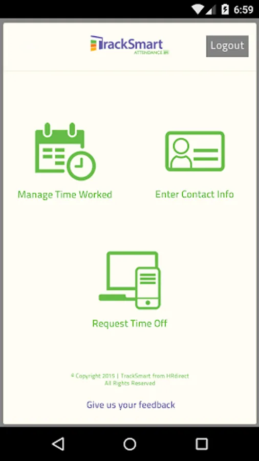 This mobile app supports the TrackSmart Attendance Employee Self-Service features, allowing employees to submit time-off requests and time sheets through their Android phone.