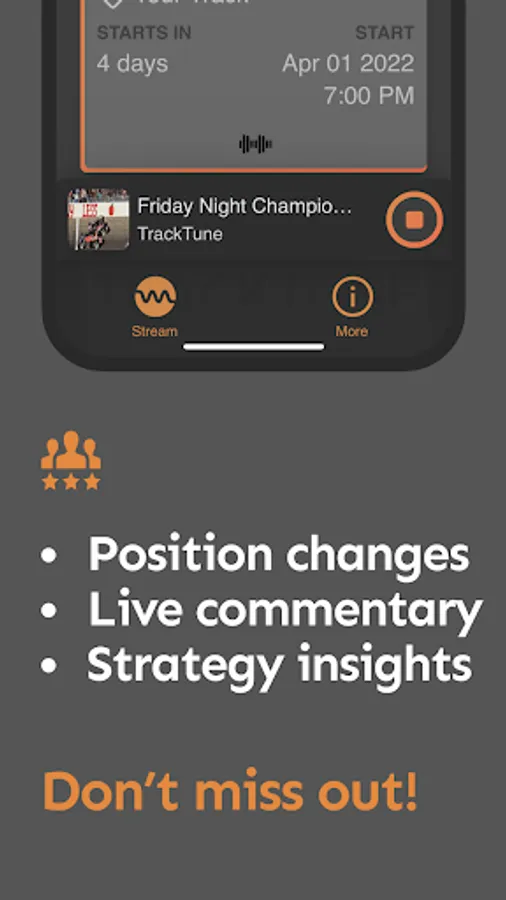 Find your track and tune in! Simply scroll to find your venue, ensure the channel is set to “Live”, and click “Join Now” to get access to the audio stream.