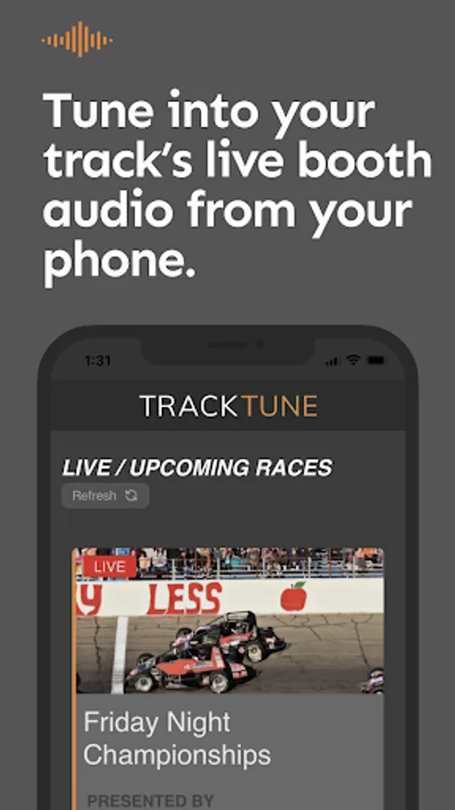 As all motorsport fans know first-hand, racecars are loud; so loud that fans can never hear the on-site announcer. TrackTune is an audio fetching service that broadcasts the booth audio straight to your phone. With only a few clicks and a pair of headphones, you can get real-time access to standings, lead changes, driver profiles, and more. No cumbersome radio equipment. No annoying paywalls. Just racing as it should be experienced.