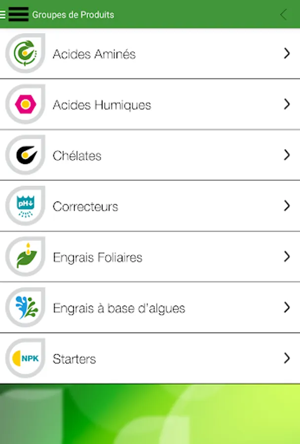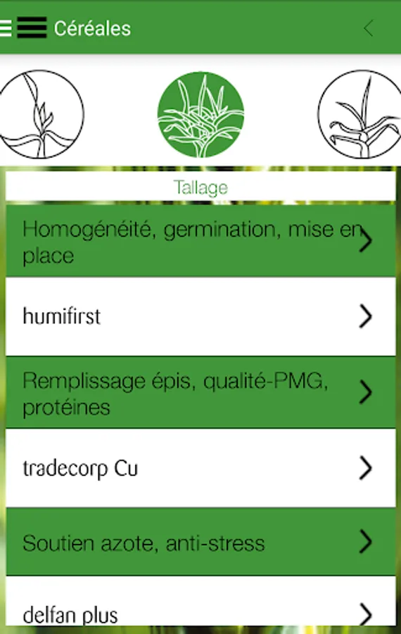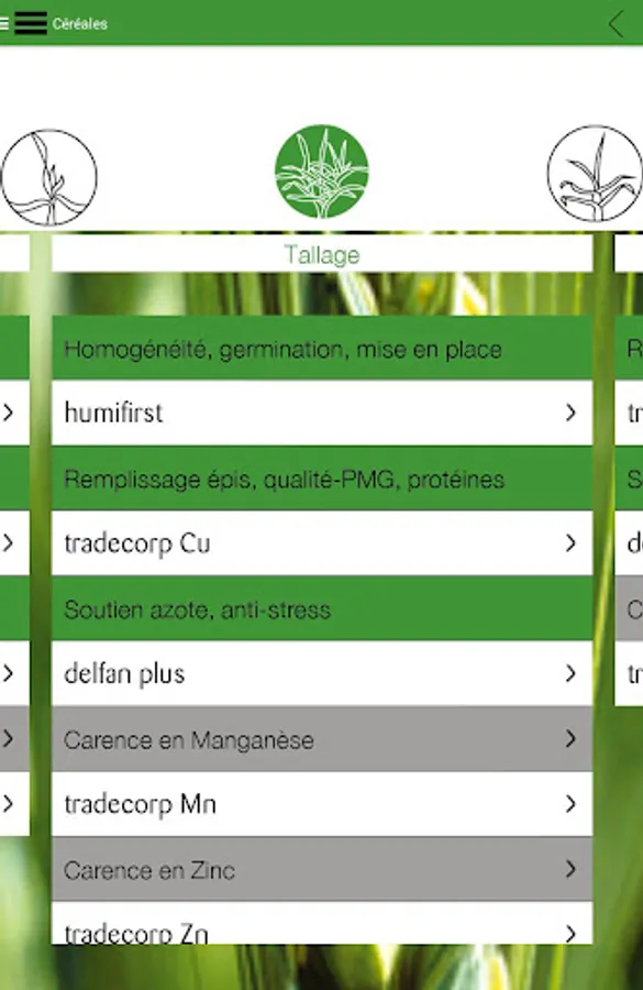"Product Catalog": This section focuses on recommendations for each product (doses for each crop stage of application, composition).