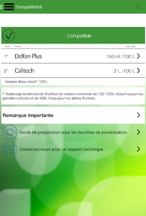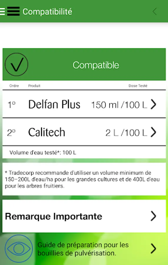 "Compatibility": This is a tool to simplify the application and explains how to prepare the spray solution, including mix order and how to proceed.