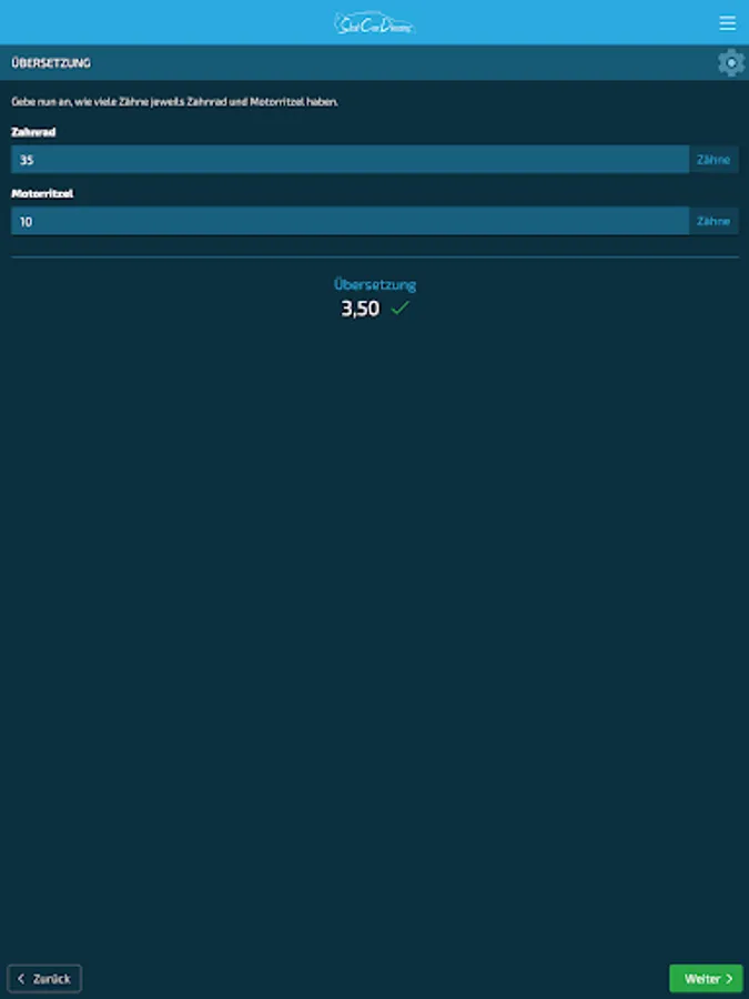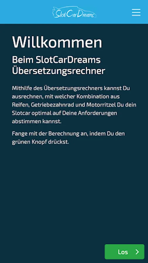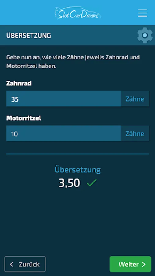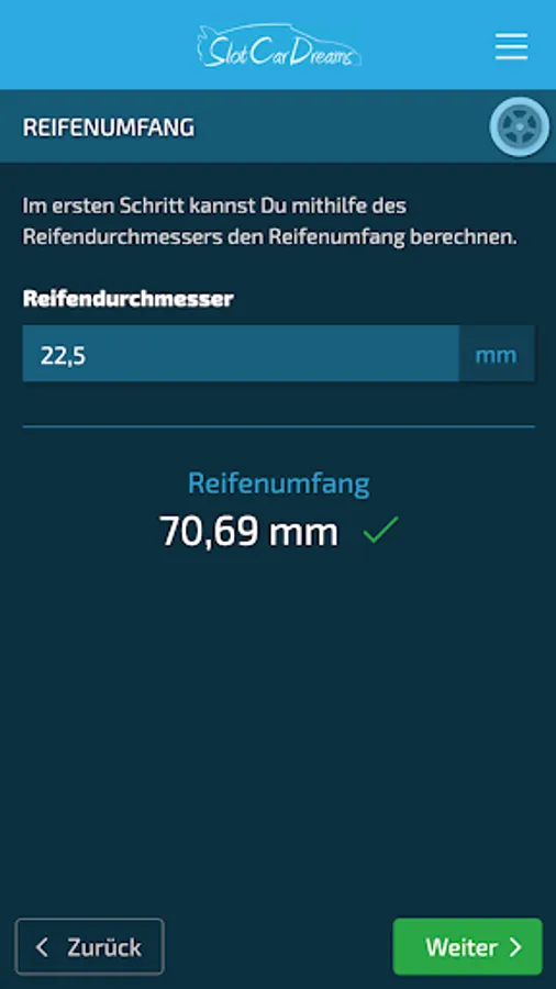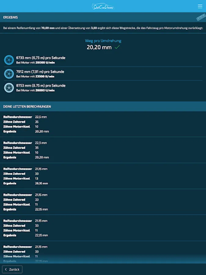 With the help of the SlotCarDreams translation calculator, you can easily calculate which route a vehicle covers with different transmission parameters. You simply enter some data and the app calculates the route from it.