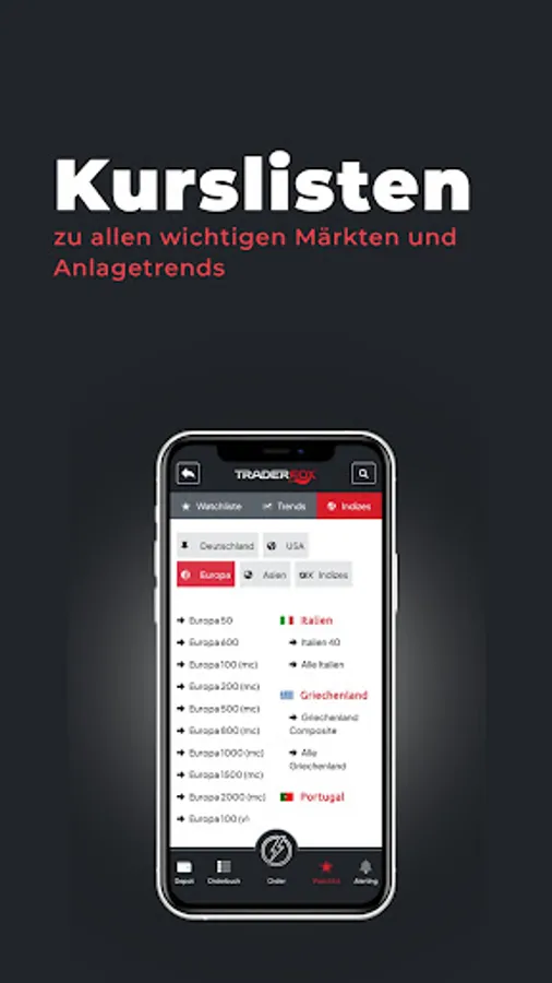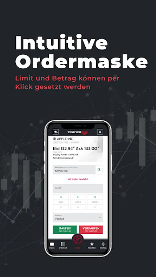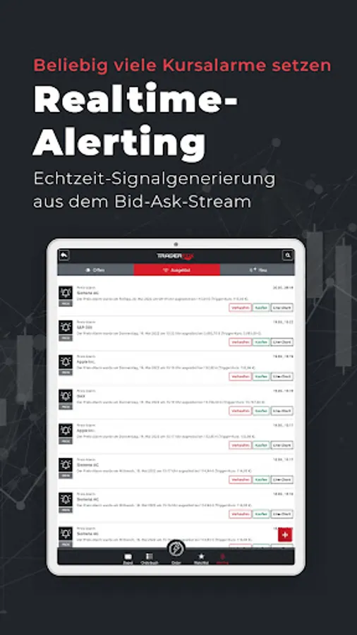 Our algorithm finds suitable derivatives for a desired leverage. Price changes in stocks and markets can be followed in real time via the live charting module. Our alert function allows you to monitor the price of securities. When a price alert is triggered, a push notification is sent. Valuable professional functions such as real-time premium calculations or leverage-adjusted investment grades complete the offer.