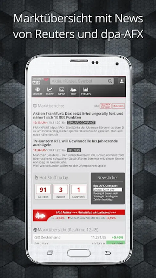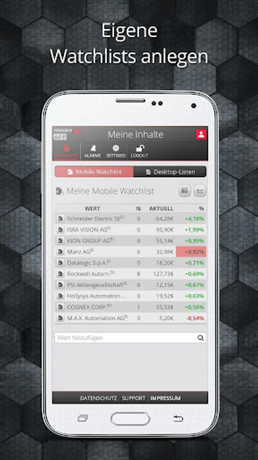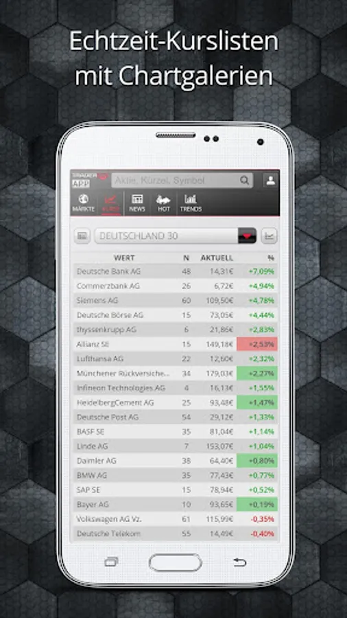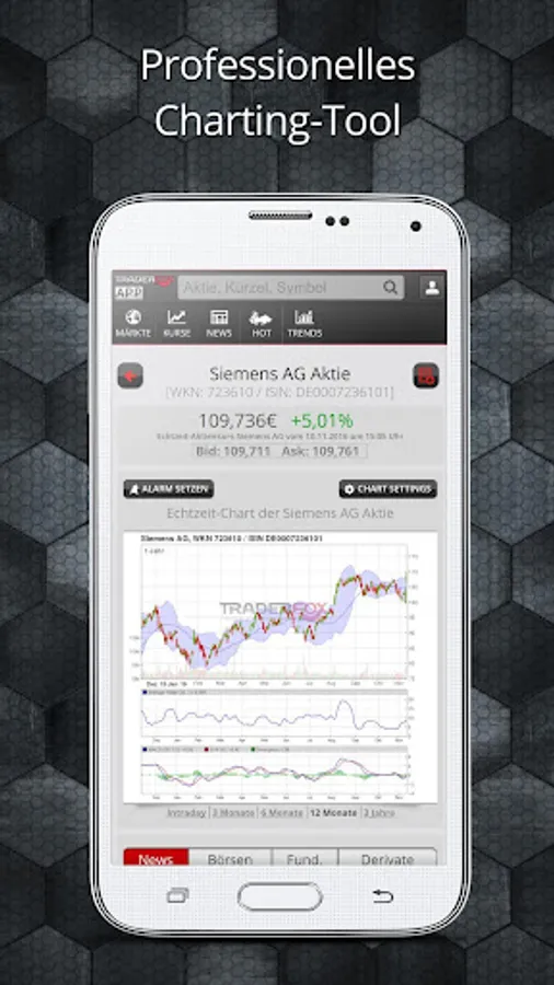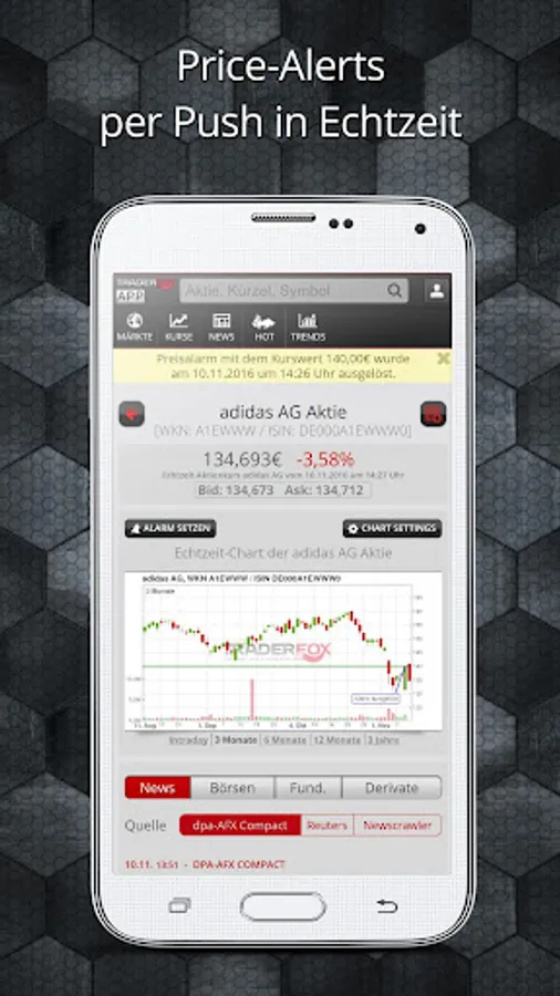 The Trader app by Traderfox gives you all the important basic information necessary for her as the DAX for trading stocks, forex or indices. We optimize our app for traders who wish to quickly retrieve real-time information. We place great emphasis on our push functionality. You can define Price Alerts to be notified instantly via push when stocks, markets or other securities reach certain price brands.