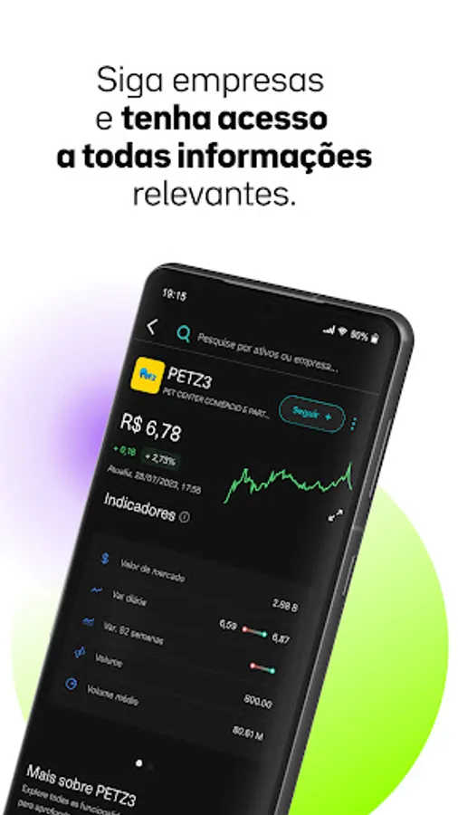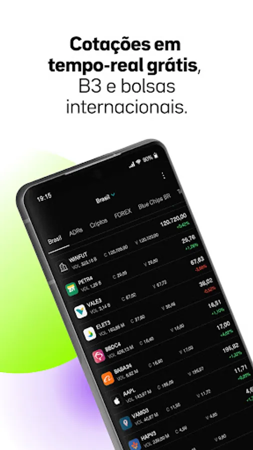 Ao lado das cotações de ações em tempo real, visualize o valor de abertura, mínimo, máximo e fechamento, veja o volume negociado e visualize gráficos pelo time-frame desejado.