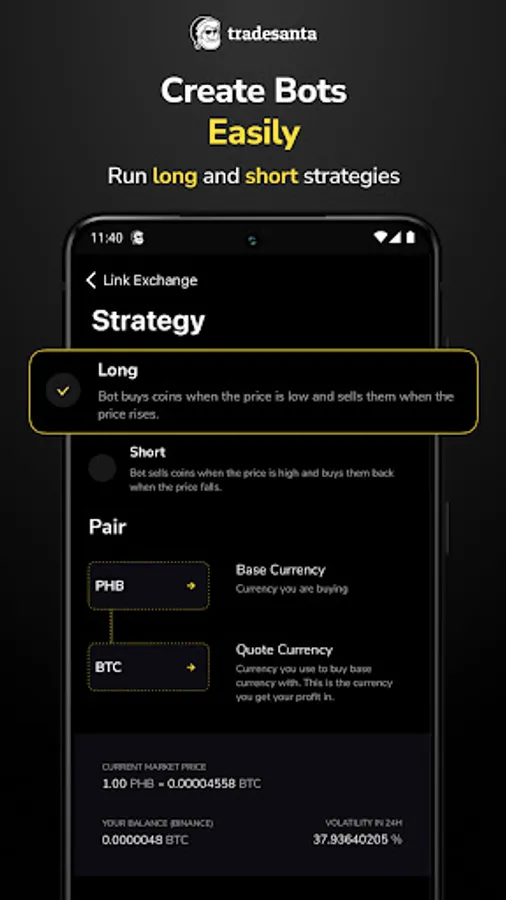 No worries. Just link your cryptocurrency exchange to the trading bot, eg Binance platform, and proceed to the screen with all the settings needed. TradeSanta is the best BTC trading app out there, and it will guide you into the setting of your first trading bot.