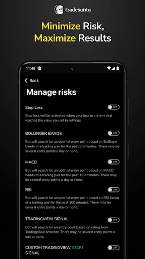Set up a crypto bot and save your time by automating the crypto trading routine with TradeSanta. Connect TradeSanta automated crypto trading platform to your exchange and manage your bots right from the smartphone.