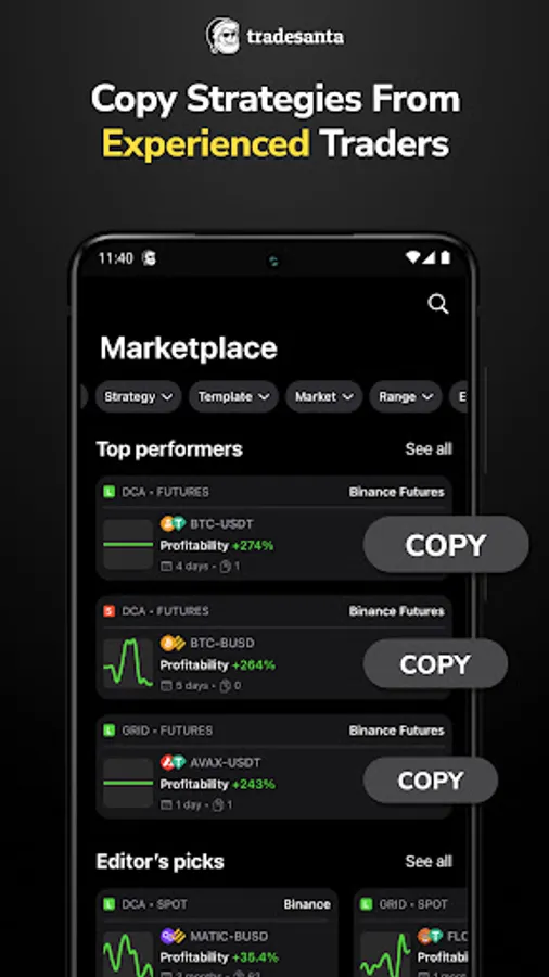 • Choose between Grid and DCA cryptocurrency trading strategies, the best known trading algorithms.