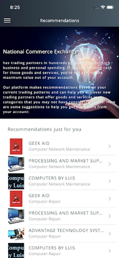 The National Commerce Exchange App for the Android is the ultimate tool for accessing your NCE account on the go. Now manage your up-to-the-minute account activity, find the newest exchange members, see businesses nearby, find goods and services available for trade and process barter transactions using your Android device from anywhere in the world where you have a data connection. Put the full power of barter in your hands with the National Commerce Exchange App for the Android.