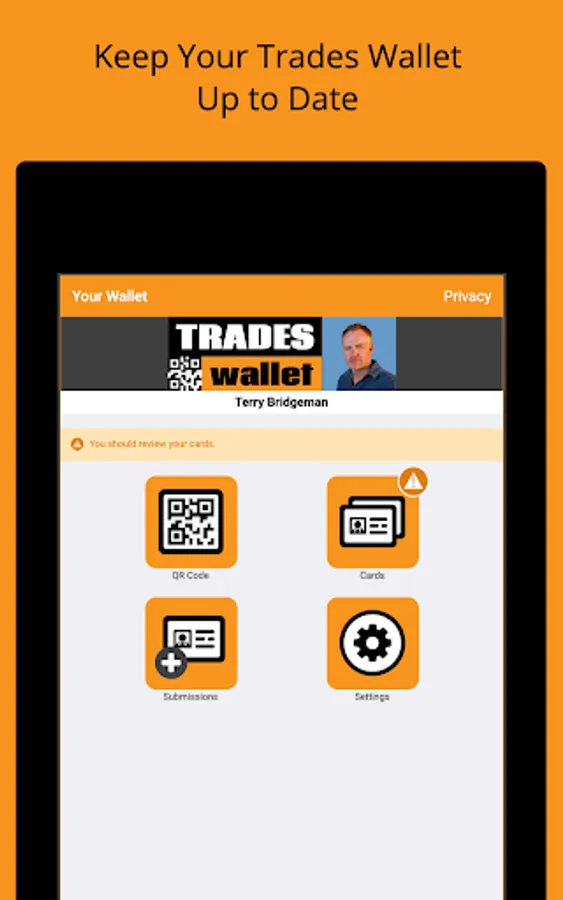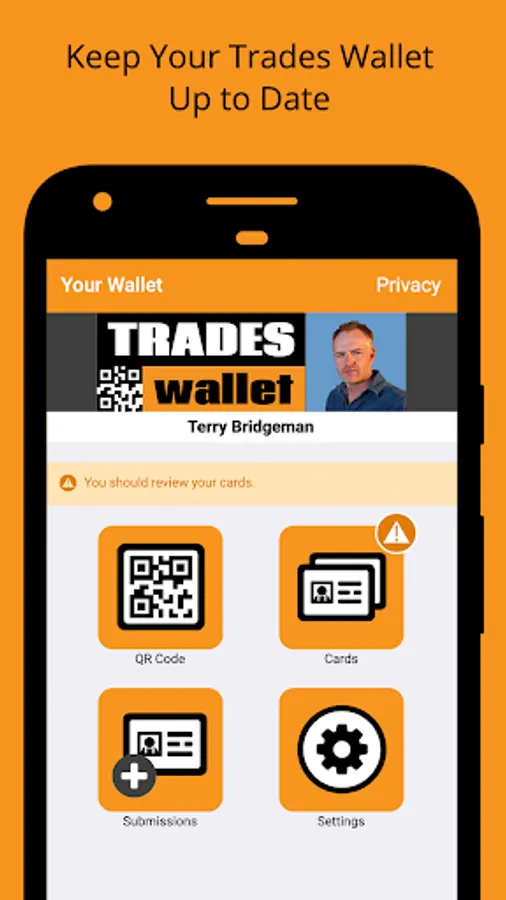 The Trades Wallet Self Service mobile application is used to manage the contents of your very own Trades Wallet, including updating your profile picture, and submitting new cards to your Wallet.
