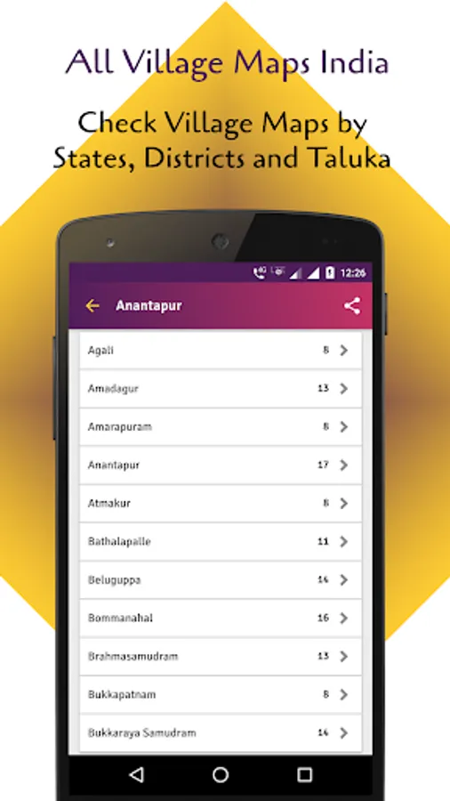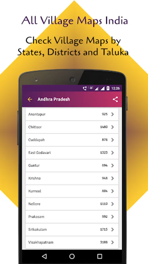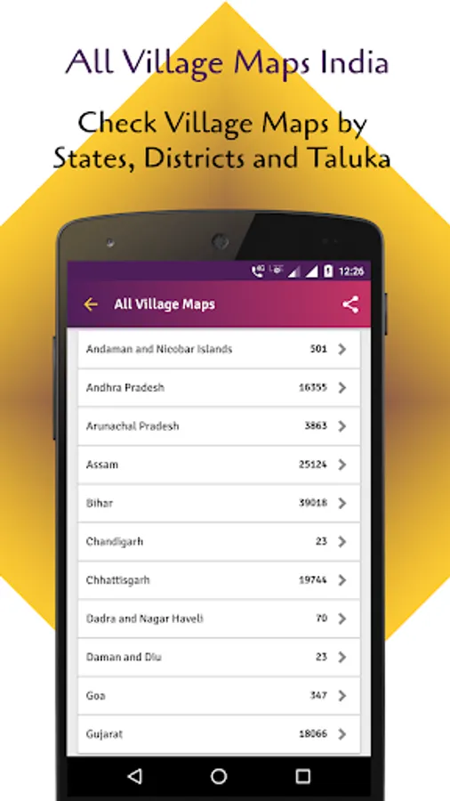 Check All Village Maps India - गांव का नक्शा by states, district map of India. Indian village maps allows to save to my village. See state wise, districts of India, sub district and village data. You can also check village maps of India live using this app.