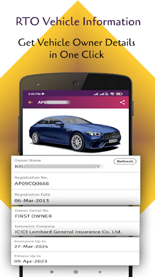 Find RTO vehicle information or Indian vehicle details RTO app of any accidental, parked, or theft vehicle by just entering the vehicle registration number. Get vehicle information on vehicle owner name, ownership, pending traffic e challans, rc, vehicle type, make, model, insurance, fitness, pollution etc.