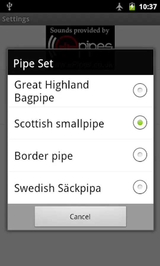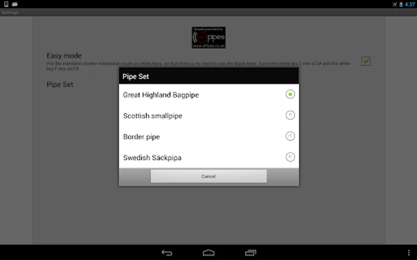 The Scottish bagpipes samples are supplied by ePipes.co.uk based on their "Studio Piper" virtual MIDI bagpipes instrument. If you want to control bagpipe sounds using MIDI, be sure to check out their products. The sounds in this app can only be played from the Android device, not MIDI.