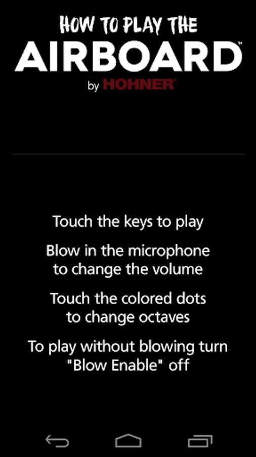 Touch the Hohner logo at the upper right corner of the screen to visit the Hohner AirBoard website.