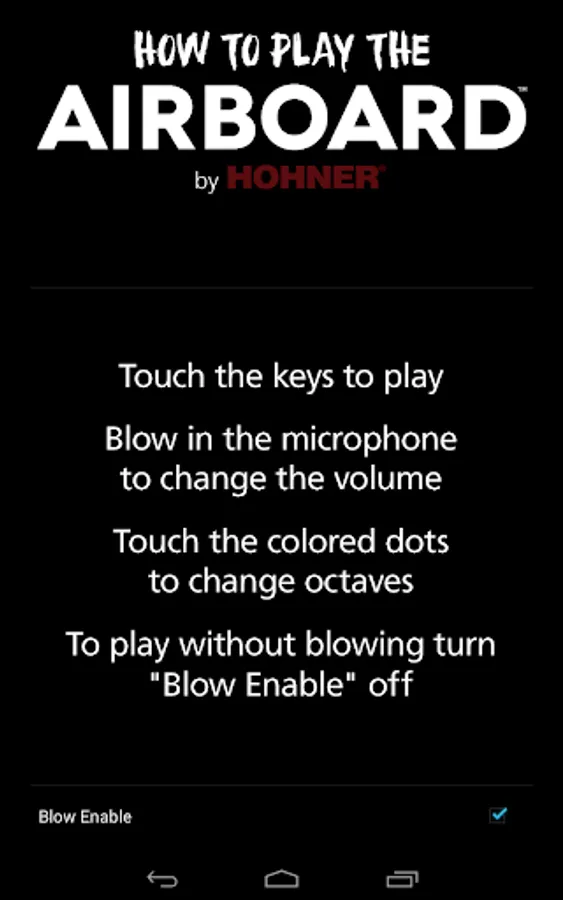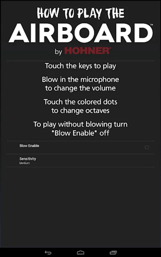 Like the real AirBoard, you can play the app by blowing into the microphone and pressing the keys, or you can turn off the blowing feature and play by just pressing the keys.