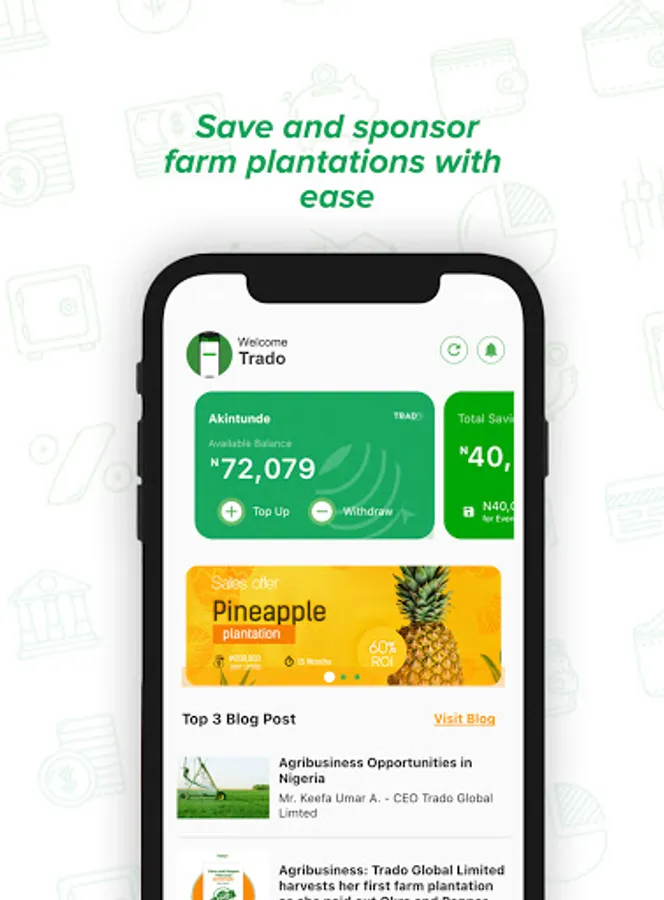 Trado Global app is a plug 'n' play digital agricultural investment and savings platform that allows you conveniently fund farmlands and earn attractive returns from the comfort of your homes. We ensure that you earn up to 60% returns on investment while empowering and supporting farmers in building a sustainable food future. With the Trado app on your fingertip, you can save smartly and earn returns by investing from wherever you are, with no sweat and no old fashioned paperwork.