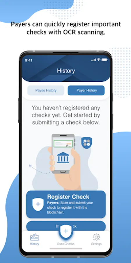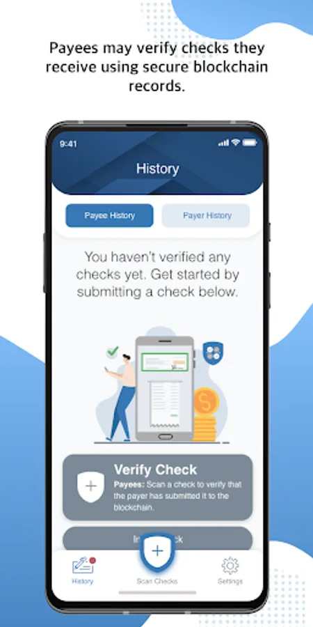 Verify Checks – Payees can scan checks they receive to verify the payers they are doing business with are authenticated and trustworthy. The app will let any payee know if the payer has registered a check and if there is a sufficient balance for the pending payment.