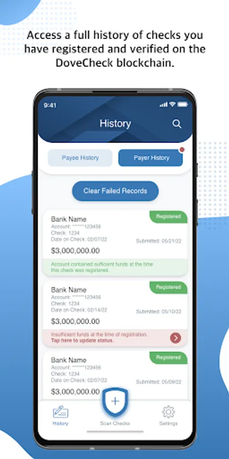Register Checks – Payers can scan and register checks they write to the DoveCheck blockchain, presenting a clear and verifiable record of the payment for their business partners. Additionally, DoveCheck can authenticate the balance of the payer’s account at the time the scanned check is registered.