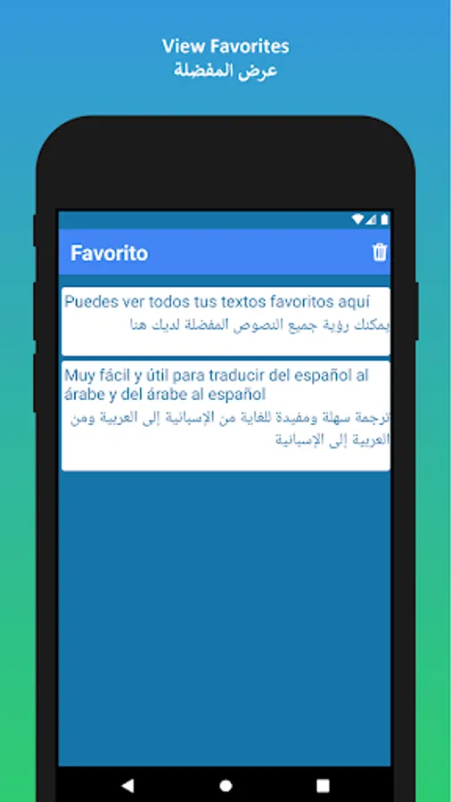✓ Use it as a Dictionary. You can type your words in Spanish and get the exact word in Arabic. You can type your words in Arabic and get the exact word in Spanish.