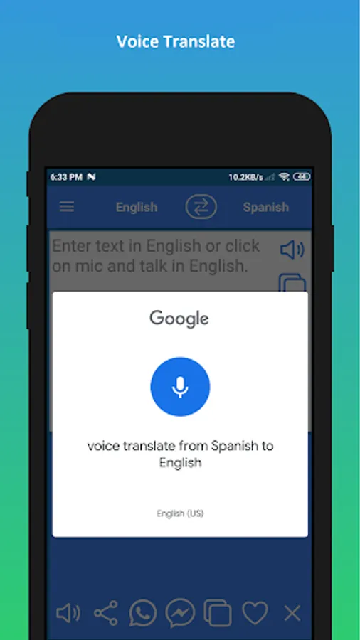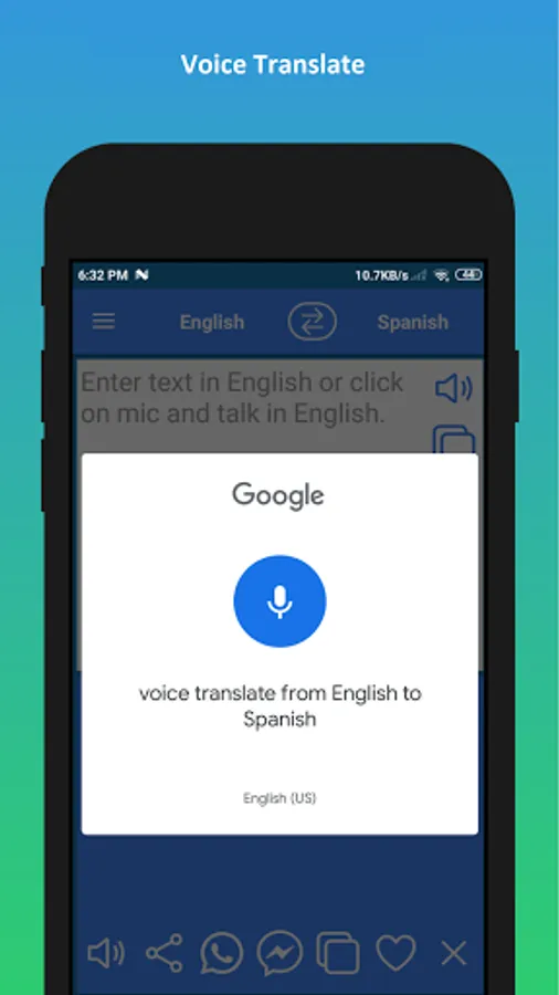 ✓ 4. Voice typing in English. Voice Translation from English to Spanish.