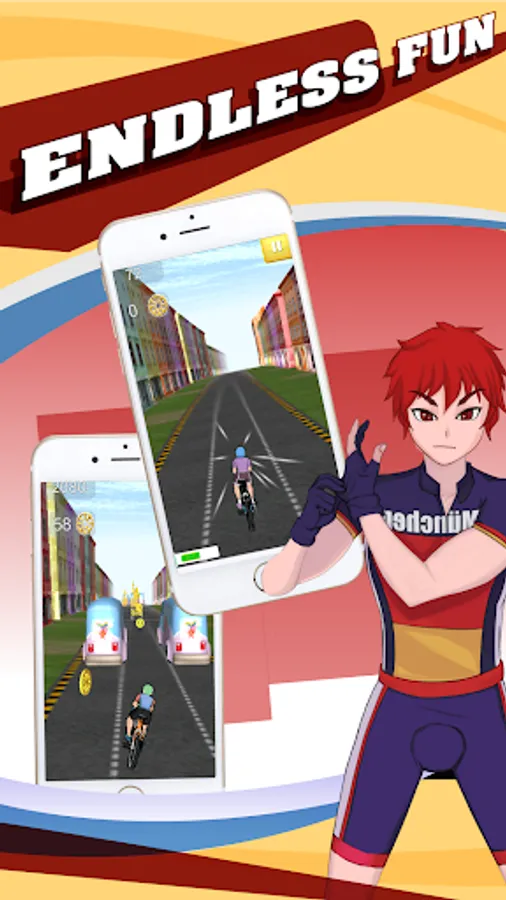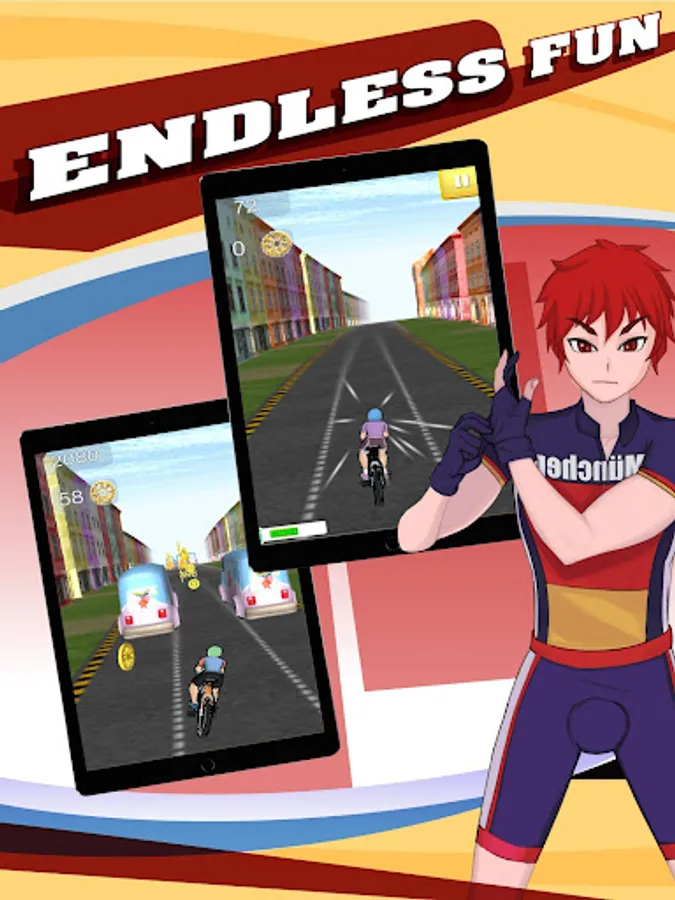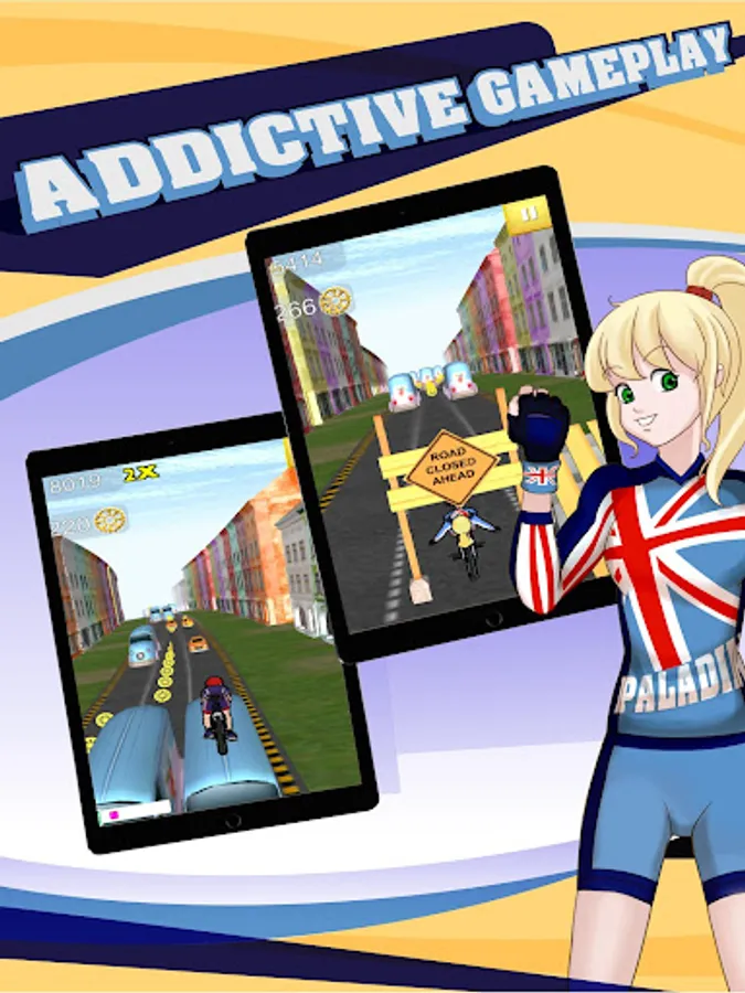 In the most exciting infinite play game yet! Choose from five stylish characters, jump on your bicycle and experience cutting edge 3D action as you ride through this adrenaline-fueled world. Enjoy the multiplayer feature and play with friends from all over the world! Execute tricks as you go to earn more points. The more you play the more you earn! Download now to start the adventure!