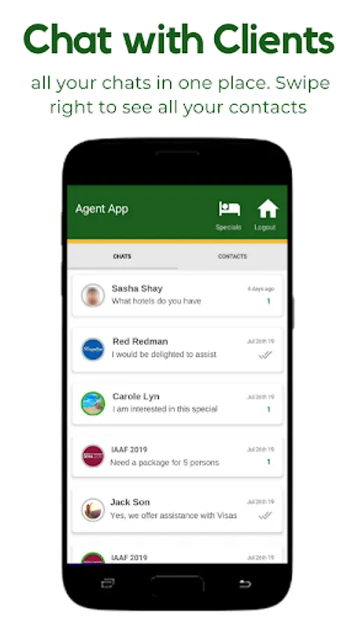 Agent App enables Travel Consultants to interact in realtime with their Clients. Share an image, send a pdf document, or close a deal right at your fingertips. Once an event is being promoted, you will be able to interact with all interested Clients from the homescreen.