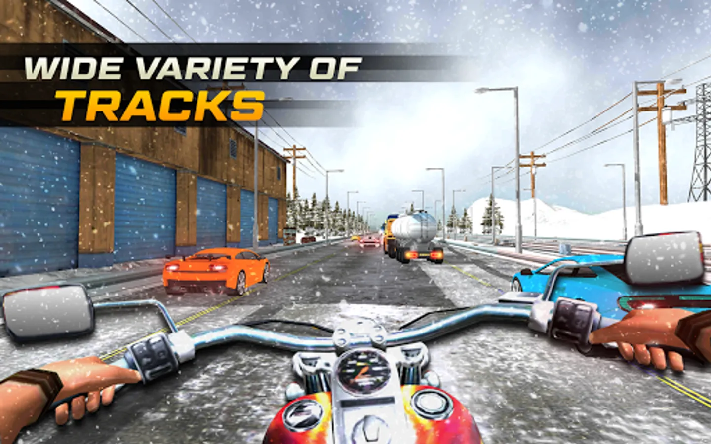Among all traffic Motor Bike driving games this game is unique with three different environments open from level one. Traffic bike challenge in Snow, Desert and Highway are the options provided in this type of motorcycling moto rider games. Turbo Traffic Racing is fun with Different Camera angles in this type of traffic race bike games.