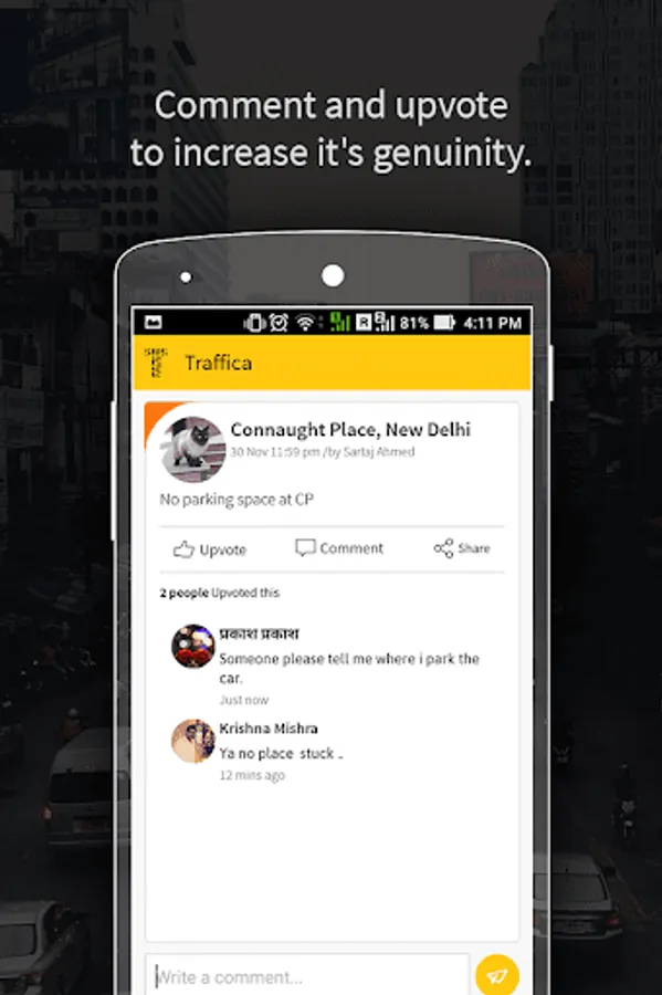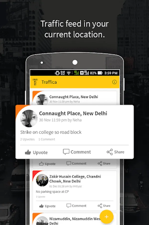 Traffica is a social app that helps you know about traffic details of a particular location through traffic news feed. The news feed will help you to avoid traffic jams and use an alternate route to reach your destination thus saving your time & fuel. Each Traffica news feed is posted by common people. You can upvote or comment a traffic news feed to increase its genuinity. You can also post a new traffic news feed for a particular location. A new traffic feed can be anything like suggesting an alternate route for others to avoid the traffic jams, a road accident at a location, VIP movement or anything else. Each traffic news feed has a color towards its top left corner. The color indicates the severity or intenseness of the traffic feed with red being highly severe, followed by orange and then green. To know traffic news of your current location just turn on your GPS.